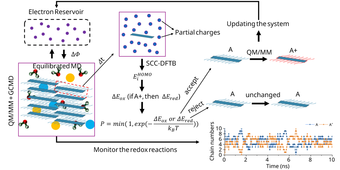 We developed an innovative simulation protocol of QM/MM + Grand Canonical scheme + classical molecular dynamics simulation (QM/MM + GCMD) where redox species in solution are in equilibrium with an electrode at a controllable electrochemical potential (Φ). Based on this protocol, we study how the microstructure and charge distribution change in the polymer in OMEICs under different Φ.
